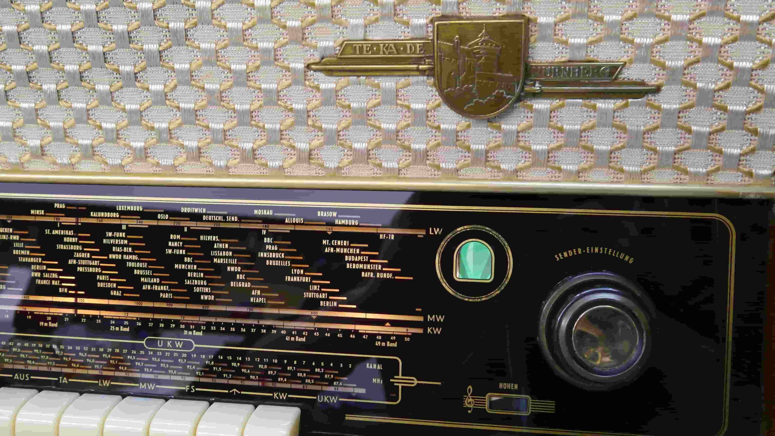Nahaufnahme eines TeKaDe Röhrenradios mit sichtbarem Lautsprechergitter, Stoff weiß/gelb, Markenemblem und Skala mit Frequenzanzeige, Magisches Fächerauge sowie Sender Einstelldrehknopf.